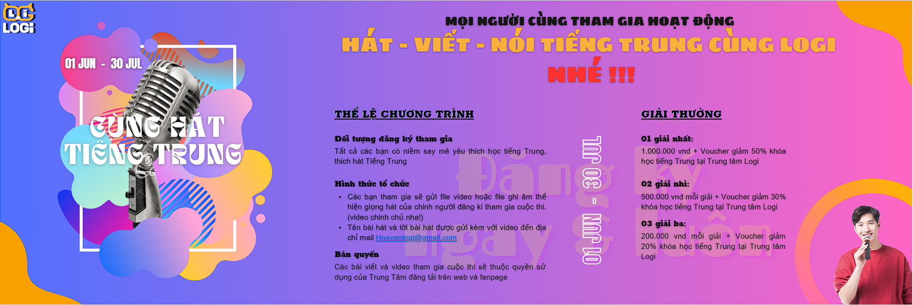 Các buổi học tiếng Trung thú vị đã phát hiện ra việc học tiếng Trung trở nên dễ dàng hơn, thuộc sâu nhớ kỹ hơn là nhờ học qua các bài hát. Đây cũng là cách để các bạn không còn ngại ngùng e dè khi phải nói tiếng Trung. Do đó, Trung tâm Hoa văn Logi tiến hành tổ chức cuộc thi hát tiếng Trung dành cho các bạn học viên và đông đảo các cá nhân muốn tham gia.